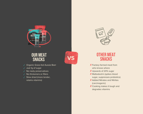 It’s important to recognise that every time we cook food we “process” it. A whole food product is defined as “a food that has been processed or refined as little as possible and is free from additives or other artificial substances”. Our products are whole foods, not “processed meats”, because they’re made with high quality meat, with a few herbs and natural ingredients. They’re dried using a traditional process (which is healthier than cooking it at high temperature) without the ingredients found in “processed meats”.